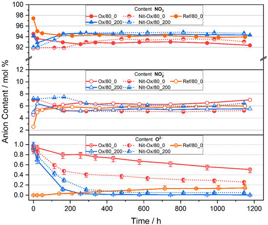 In the reference experiment (Ref/80_0) with pure Solar Salt (Figure 3, orange) the nitrite content increased before it reached a steady state at 6.0 (±0.1) mol%, while the nitrate content stabilized at 93.9 (±0.1) mol%. This result is consistent with thermodynamic expectations (93.3(±0.3):6.7(±0.1) mol% NO3−:NO2− [7]) and in agreement with Equation (1), where increasing the oxygen partial pressure will push equilibrium composition to the nitrate side, thereby lowering the nitrite content. The detected oxide ion concentration increased continuously, with a final value of 0.14 (+0.01 − 0.02) mol% at 1150 h. This behavior is again explained by the fact that all gases evolving from the molten salt are purged out of the test rig, allowing no equilibration of Equation (2).