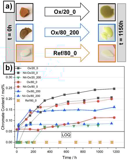 (a) Salt sample appearance initially (t = 0 h) and at the end of the experiments (t = 1150 h); (b) Chromate content over time of the molten salts. Limit of quantification (LOQ) indicated as gray bar. Reference data shown (Ref/80_0) did not contain oxide impurity. Error bars lay inside symbol.