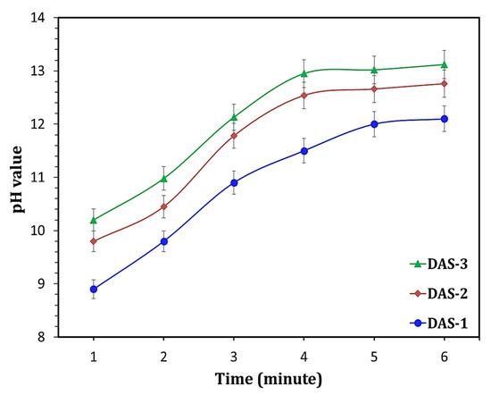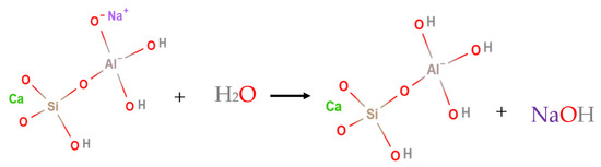 To identify the reactivity of activated species, the leaching test was applied to the prepared DAS. As shown in Figure 2, a significant rising in pH-value in a short time (5 min) was recorded after suspension of DAS-powder in water. The possible explanation of this outcome is the moving Na cation at the ortho position within activated species, forming sodium hydroxide in the water medium (Figure 3). This means the high hydraulic reactivity of DAS, as the activation process can be continued after water addition. It can be said that the DAS acts as a carrier of NaOH, which strongly contributes to resolve the corrosive nature of alkali solutions during the preparation of one-part HC.