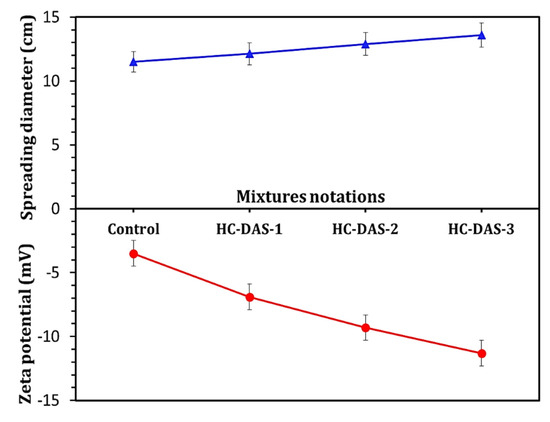 The impact of NaOH contents within DAS on the workability and zeta potential of fresh one-part HC mortar is represented in Figure 4. Generally, the spreading diameter of the fresh HC mortars indicates their workability. The fresh HC mortar with the broadest speeding diameter exhibits the best fluidity. There is a direct relationship between the flowability of the mortar and the negative zeta potential values. Increasing the NaOH content within DAS leads to a significant enhancement in the workability, which coincides with an increment in negative zeta potential value, as in line with the previously published work [41], which stated that the addition of Na2O content enhances the workability of one-part alkali-activated cement. He et al. [42] proved that increasing negative zeta potential is mainly originated from an increment in the electrostatic repulsive force between cement particles, resulting in an enhancement in the workability of the fresh cementitious material.