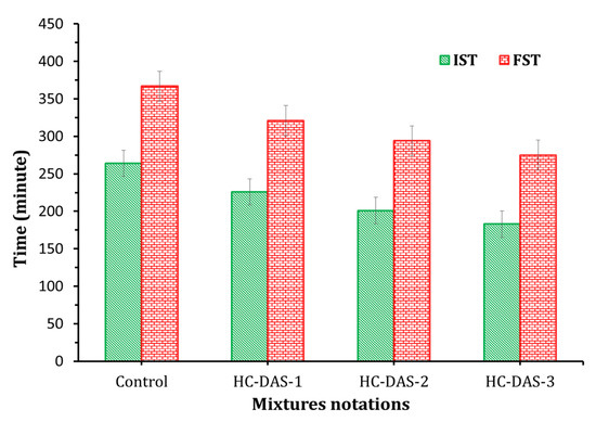 The initial and final setting times (IST and FST, respectively) of the fresh BFS-OPC and DAS-OPC pastes are shown in Figure 5. The setting time of the fresh cement paste mainly depends on the content of NaOH within DAS. Depending on the composition of the fresh cement pastes, the IST was identified after 183–264 min; meanwhile, the FST was recorded after 275–367 min. One-part HC samples record shorter IST and FST compared to the BFS-OPC blend. The setting time decreases toward control > HC-DAS-1 > HC-DAS-2 > HC-DAS-3. This means that increasing NaOH content has a significant effect on the dissolution of aluminosilicate and the formation of binding phases [43].