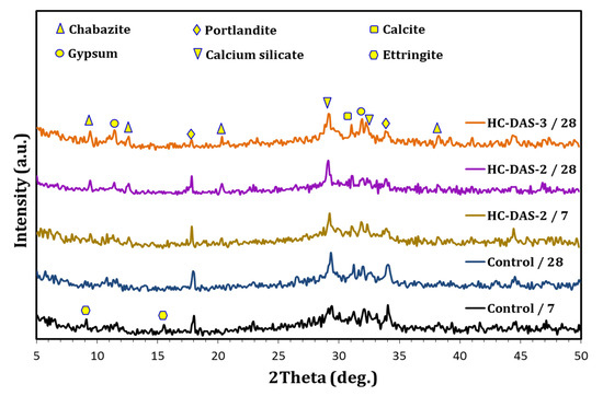 XRD patterns of the control sample and HC-DAS-2 pastes at 7 and 28 days as well as the HC-DAS-3 mixture at 28 days of curing.