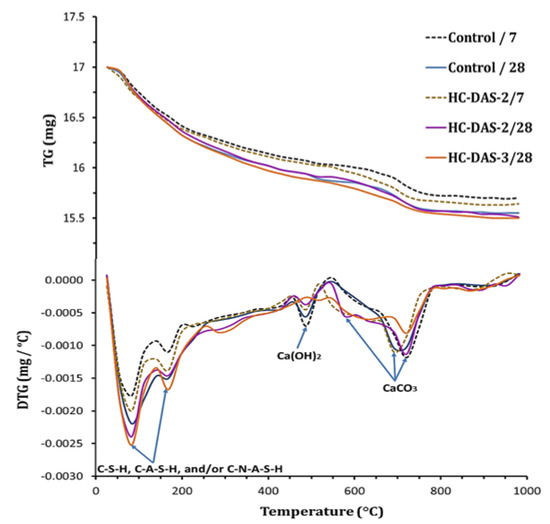 TG/DTG curves of the control sample and HC-DAS-2 pastes at 7 and 28 days as well as the HC-DAS-3 mixture at 28 days of curing.