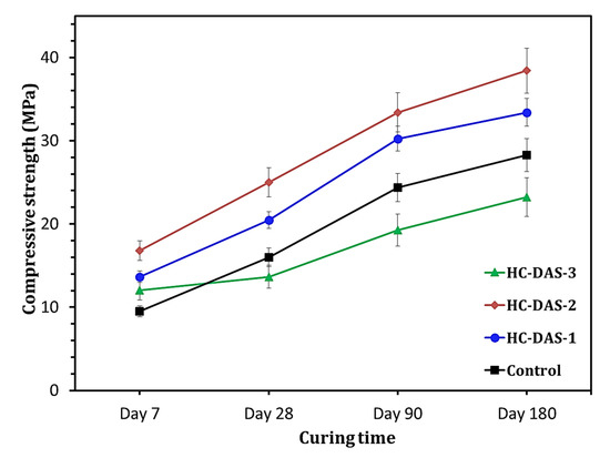 The compressive strength values of the hardened BFS-OPC and one-part HC mortars are graphically represented in Figure 8. Increasing curing time (up to 180 days) is found to have a positive impact on the compressive strength development. This means the successive formation of strength-giving phases (C-S-H C-A-S-H, and/or C-N-A-S-H) with time advanced as confirmed by XRD and TG/DTG analyses. The same trend is observed in the previously published reports [33,59,60]. Increasing NaOH content within DAS up to 2 wt.% materially improves the early compressive strength (at 7 days). The NaOH-content beyond 2 wt.% reduces the 7th day compressive strength, but it is still higher than that of the control sample (BFS-OPC). One-part HC mortars individually containing DAS-1, DAS-2, and DAS-3 exhibit 7th day compressive strength of ~44%, 77%, and 27%, respectively, higher than that of the hardened BFS-OPC mortar. At later ages (28 to 180 days), the HC-DAS-1 and HC-DAS-2 show the same trend. The hardened HC-DAS-3 achieves later compressive strengths lower than those of the control sample. This proves the fact that the NaOH-content released from DAS (Figure 5) plays an important role in the performance of one-part HC mortar.