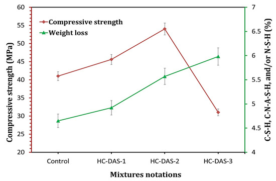 It is recognized that the enhancement of hydration products’ content strongly reflects on the mechanical properties of the hydrated cement [37,41,53,61,62]. Accordingly, a relationship between compressive strength and hydration products content (determined by TG analysis) within cement pastes hydrated for 28 days is represented in Figure 9. Increasing NaOH content (up to 2 wt.%) enhances formation of the hydration products and compressive strength. Although the hydrated sample having 3 wt.% exhibits the highest hydration products content, it demonstrated compressive strength values lower than those of other HC mixtures and the control sample. These variations in outcomes confirm the fact that the DAS with appropriate Na2O content should be prepared to achieve the high performance of one-part HC.