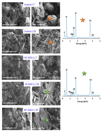 FESEM micrographs of the control sample and HC-DAS-2 mixture at 7 and 28 days of curing as well as the HC-DAS-3 mixture at 28 days of curing.