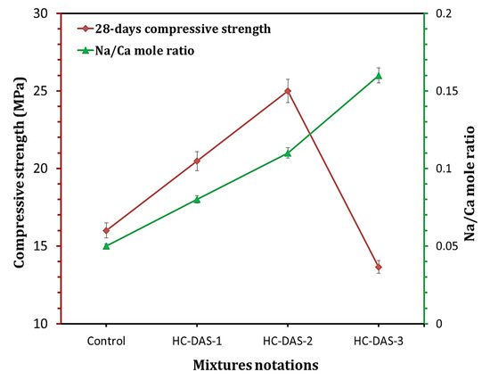 As suggested by Shi et al. [63], the Na2O could interact with C-S-H through different three mechanisms. The neutralization of acidic silanol group (Si-OH) is the possible first reaction. The second mechanism includes the partial replacement of Ca ion in C-S-H to yield N-C-S-H. Meanwhile, the third mechanism is the formation of Si—O-Na+ through the complete destruction of the binding capacity of C-S-H. It can be said that these mechanisms mainly depend on the content of Na2O in the cement matrix. The first and second mechanisms happen in the presence of relatively low Na2O content, whereas the third occurs at the high Na2O content. For HC-DAS-1 and HC-DAS-2 mixtures, the appropriate Na2O-content leads to the formation of N-C-A-S-H accompanied by compressive strength development. Conversely, a competition between second and third mechanism could happen in HC-DAS-3 mixture, resulting in the formation of hydration products with lower binding capacity compared with those of other samples.