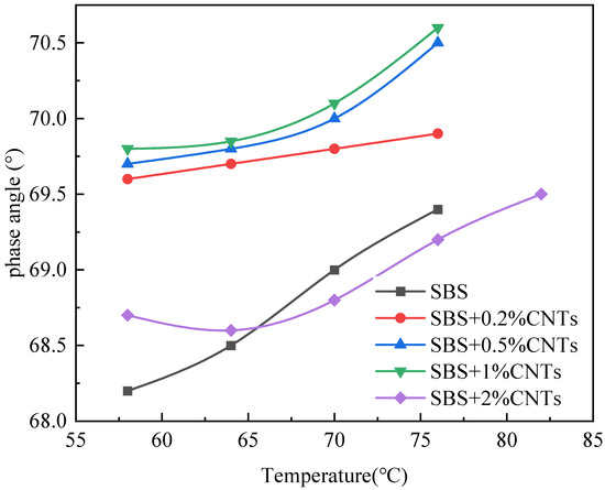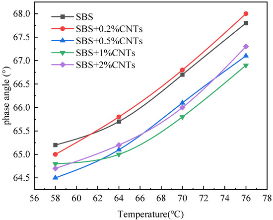 The Superpave specification proposes using the rutting factor (G*/sinδ) and phase angle to evaluate high temperature rheological properties of the asphalt binder. The larger the G*/sinδ is, the better the rut resistance of the asphalt binder [27,28,29]. The phase angle is related to the rheological properties of asphalt binder, and the viscoelastic properties of asphalt binder change with the change of the phase angle. When the phase angle moves to a high level, the asphalt binder changes to a viscous state, and when the phase angle moves to a low level, the asphalt binder changes to an elastic state. In this paper, the SBS-modified asphalt binder without CNTs was used as the control group and CSCMAB as the experimental group to compare the influence of CNTs on the rheological properties of the SBS-modified asphalt binder. Dynamic shear rheological tests were performed on the unaged asphalt binder and the 30 h UV-aged asphalt binder. The results are shown in Figure 1, Figure 2, Figure 3 and Figure 4 [30].