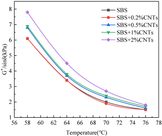 The addition of CNTs can improve the rutting factor, and the greater the addition of CNTs, the greater the increase in the rutting factor, indicating that CNTs can improve the high temperature performance of the SBS-modified asphalt binder. CNTs can delay the increase rate of the phase angle of the SBS-modified asphalt binder with a temperature increase; thus, inhibiting the transformation of the SBS-modified asphalt binder to a viscous state and increasing the elasticity of the SBS-modified asphalt binder to resist deformation. After UV aging, the 2% CNTs had the best effect on inhibiting the SBS-modified asphalt binder aging and hardening.
