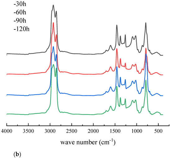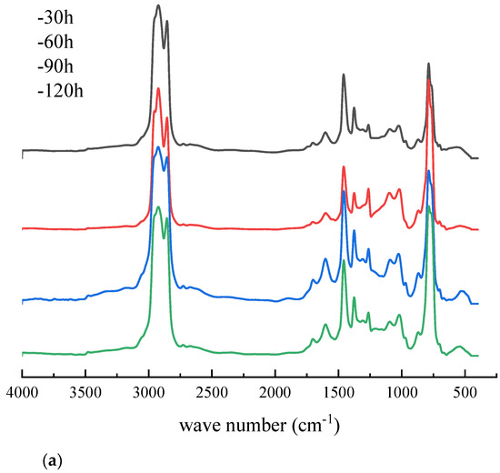From the analysis of Figure 7, it can be seen that with the increase in ultraviolet light irradiation time, the content of methyl and methylene in the asphalt binder changed. Therefore, it was inferred that the chain length of the alkane and naphthene in the asphalt binder composition changed with the increase in ultraviolet light irradiation time.