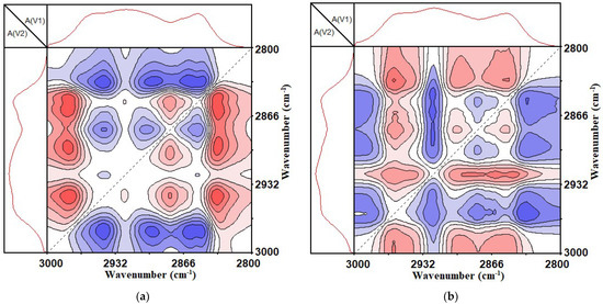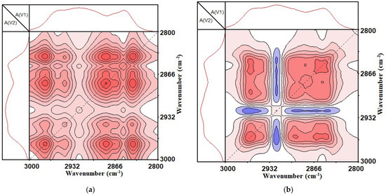Two-dimensional asynchronous infrared correlation spectrum of 3000~2800 cm−1. (a) SBS-modified asphalt binder; (b) SBS + 1% CNTs composite-modified asphalt binder.