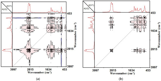 Compared with the one-dimensional infrared spectrum, it was found that 2880–2894 cm−1 and 2964–2975 cm−1 did not show a significant peak in the one-dimensional infrared spectrum. This showed that the stretching vibration of the methyl and methylene functional groups in the asphalt binder was difficult to observe in the one-dimensional infrared spectrum due to the weak absorption strength. This also showed that expanding the absorption peak on the two-dimensional scale could improve the resolution of the spectrum, and could distinguish between small peaks and weak peaks that were covered on the one-dimensional spectrum, thereby improving the spectral resolution ability and making up for the limitations of the one-dimensional infrared spectrum.