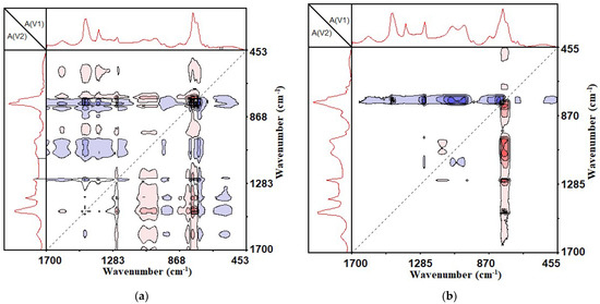 The two-dimensional asynchronous infrared correlation infrared spectrum was different from the synchronous spectrum, and it represented the order of change of the spectral intensity of two dynamic signals. There were no automatic peaks in the two-dimensional asynchronous infrared correlation spectrum, and they were composed entirely of crossed peaks on both sides of the diagonal. The generation of the asynchronous crossover peaks was due to the difference in the intensity of the two spectral peaks. The sign of asynchronous cross peaks could be positive or negative (expressed in shaded colors: red is positive, blue is negative). It can help to identify the sequence of the movement of functional groups of molecules. At the coordinate corresponding to a cross peak (ν1, ν2), if the two-dimensional asynchronous correlation spectrum and the corresponding two-dimensional synchronous correlation spectrum have the same color, it means that the intensity change at ν1 always preceded the intensity change at ν2. When the colors are different, the above rules are just the opposite [37]. The previous analysis of the two-dimensional synchronous infrared correlation spectrum determined which functional groups changed during the UV aging of the CSCMAB. Now, the order of these functional group changes was determined by analyzing the asynchronous spectrum. Among them, Figure 9 is a two-dimensional infrared asynchronous correlation spectrum chart of 1700 to 450 cm−1, and Figure 10 is a two-dimensional infrared asynchronous correlation spectrum chart of 3000 to 2800 cm−1.