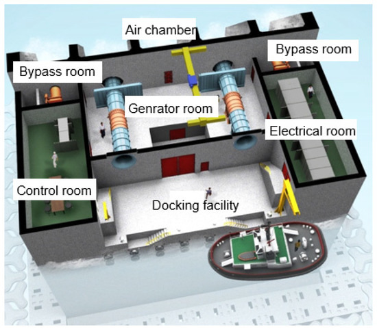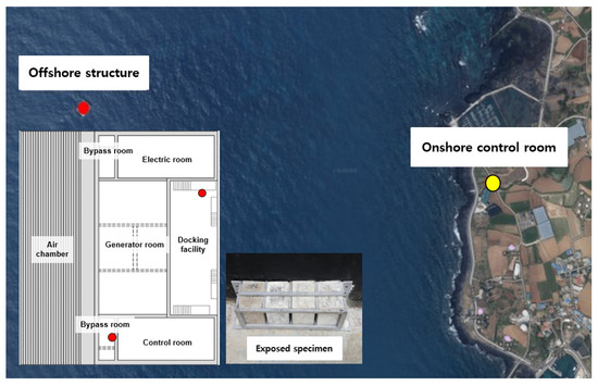 In South Korea, a wave power marine concrete structure is located off the coast of Chagwido Island to the west of Jeju Island. It is a submersible structure fabricated from reinforced concrete caissons of depth of water approximately 16 m. The weight of the structure is 14,650 tons, and its dimensions are 37.0 (L), 31.2 (B), and 27.5 m (H). As shown in Figure 1, the structure is approximately 1.2 km away from the coast, and it is connected to an onshore control room on the beach via submarine cables, which transmit electrical energy. This structure was constructed by replacing 40% of the cement with blast furnace slag cement, and the design compressive strength was 24 MPa. As shown in Figure 2, it consists of a chamber, a generator room, in which an energy conversion module is installed, and a control room, in which a power conversion system is installed. The air chamber and bypass room are exposed to an environment that can cause deterioration owing to pressure changes and chloride attack, and they are subjected to repetitive air pressures of up to 2–3 atm.