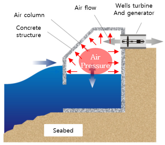 Oceans constitute approximately 75% of the Earth’s surface, and they consist of significant energy resources of various types. Marine energy is a clean energy source that can overcome the problems of environmental pollution and resource depletion due to the use of fossil fuels. Wave energy conversion modules generate renewable energy by producing electrical energy using waves in the sea. Among various wave energy conversion modules, oscillating water columns (OWCs) convert air flow into turbine rotations, where air flow is generated by the upward and downward movements of water columns in structures created by waves. The technology readiness level of OWCs is 6–8, and empirical research on OWCs in actual seas is being conducted worldwide [1,2,3,4,5].