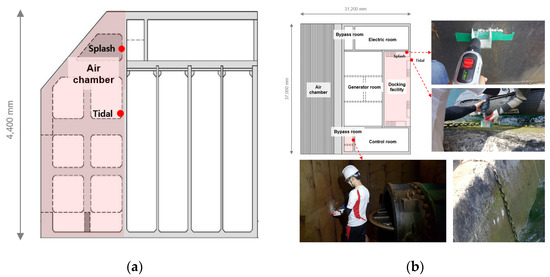 Sampling locations and images of OWC: (a) air chamber; (b) bypass room, docking facility.
