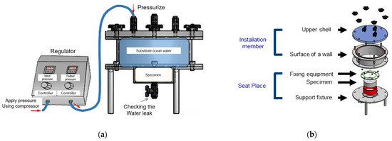 The chloride penetration durability of a marine concrete structure under pressure is less than that of a structure that is not subjected to hydrostatic or air pressure. Hence, to measure the effect of pressure on chloride-ion penetration, a test apparatus was developed to expose the specimens to pressure or chloride ions [33,34].