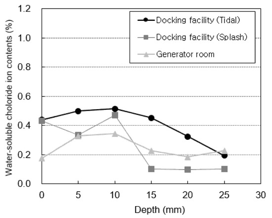 The chloride-ion penetration depth and chloride-ion content were measured by exposing the specimens to the following locations: the bypass room, which is subjected to pressure; the docking facility, which is exposed to the marine environment without being affected by pressure; and the onshore control room, where there is a concern for chloride-ion penetration by airborne chlorides [32]. Field exposure was performed for approximately one year in 2018.