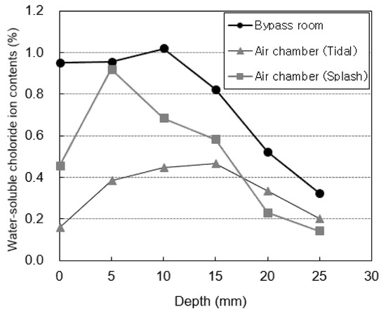 - The water-soluble chloride-ion content was measured by collecting field samples from a marine concrete structure at different locations and performing an exposure test. The air chamber and bypass room, which were under pressure, showed a high water-soluble chloride-ion content, unlike the locations exposed to atmospheric pressure. In the range of 0~15 mm, the amount of chloride was about twice as high in the place where the air pressure was applied. Furthermore, the chloride-ion penetration into concrete under the hydrostatic pressure of seawater was observed using an indoor chloride evaluation device. The water-soluble chloride-ion content rapidly increased with hydrostatic pressure and exposure period.