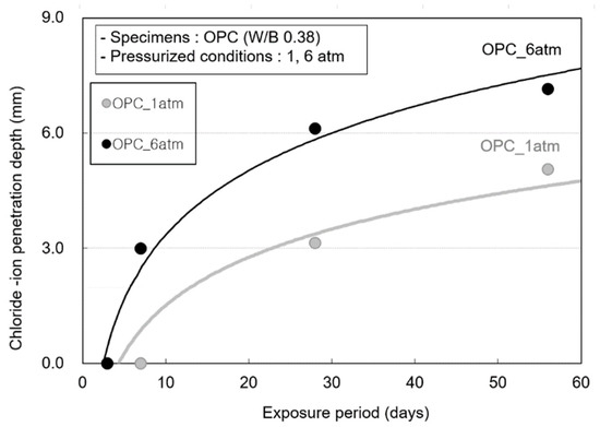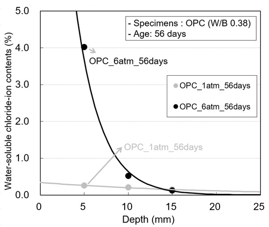 Figure 10 shows the water-soluble chloride-ion content at hydrostatic pressures of 1 and 6 atm in the OPC specimens at an exposure period of 56 days. The difference between the water-soluble chloride-ion contents at 0–5 mm and 5–10 mm at 6 atm is larger than that at 1 atm. This is because at 6 atm, the chloride-ion content at the concrete surface corresponding to a depth of 0–5 mm increases rapidly owing to sea-water penetration.