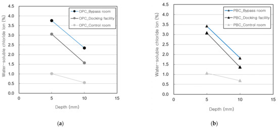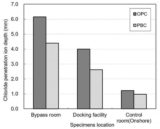 Figure 11 shows the water-soluble chloride-ion contents measured for the OPC and PBC specimens at different exposure locations. The water-soluble chloride-ion content of the OPC specimens is higher than that of the PBC specimens. In addition, the water-soluble chloride-ion content is highest in the bypass room, followed by the docking facility and onshore control room. Figure 12 shows the chloride-ion penetration depth at different exposure locations. The chloride-ion penetration depth in the bypass room is the highest, followed by the docking facility and onshore control room. This trend is similar to the results of the offshore structure sample analysis and experiment with an indoor chloride evaluation test device, which were performed previously.