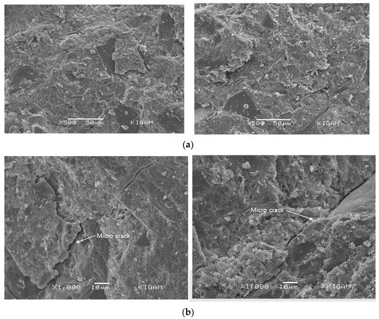 Figure 13 shows the SEM observation results for the specimens exposed to the onshore control room and bypass room. A wide-ranging formation of calcium silicate hydrate (C-S-H) and calcium hydroxide (Ca(OH)2) is observed in both specimens [37]. The difference in hydration products by cement type is not significant. Furthermore, there are considerably more micro-cracks in the specimen exposed to the bypass room compared to the specimen exposed to the onshore control room [38].
