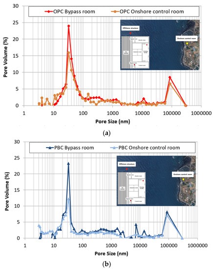 Figure 14 shows the distribution of pores by the pore size of the OPC and PBC specimens at different exposure locations. The change in the micropore structure was analyzed to determine the cause of the promotion of chloride penetration due to the previously confirmed pressure. The pores of the concrete are classified into the intermediate, gel, and capillary pores based on the pore size [39]. Among these, capillary pores (5–100 nm) strongly affect the ion penetration of cement hardeners. In the OPC and PBC specimens, capillary pores increase rapidly for specimens exposed to the bypass room. Additionally, capillary pores with a diameter of approximately 50 nm increase significantly. This can be attributed to moisture penetration due to repetitive air pressure. When pressure is applied, the water penetration ratio of concrete increases because of diffusion; this is accompanied by the internal deformation of the concrete. It is estimated that capillary pores with a diameter of 100 nm or lower increase owing to the internal deformation, and the chloride-ion penetration of concrete is accelerated by the expansion of these capillary pores.