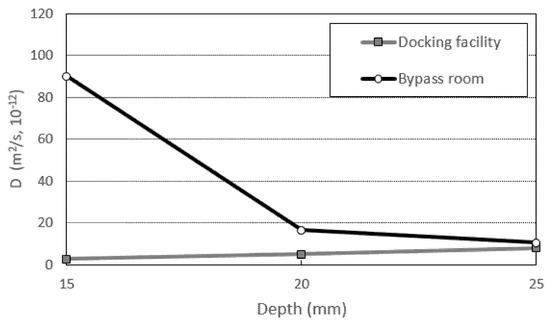 - Based on the sea sampling data, the D, which indicates the rate of diffusion, was calculated using Fick′s second law for the location receiving repeated air pressure (bypass room) and general atmospheric pressure (docking facility). The bypass room was confirmed to have a D 7.5 times higher than that of the docking facility. Since it is difficult and dangerous to access the sea for marine concrete structures subjected to repeated air pressure, an equation was proposed to predict the diffusion coefficient value at the location subjected to repeated air pressure using the diffusion coefficient at the location receiving general atmospheric pressure.