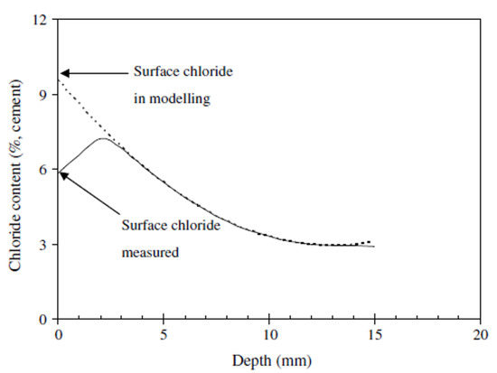 To calculate the diffusion coefficient (D), the surface chloride concentration value (Cs) should be the maximum value. From the measurements, the maximum chloride concentration value was confirmed at depths of 0 to 10 mm, and there were regions where the chloride concentration was higher on the inside than on the surface; after the maximum amount of chloride, the concentration gradually decreased. Considering these characteristics, the average value of the concentration of chloride at the depths of 0 to 10 mm was used as Cs [40,41]. In general, the Cs calculation is predicted based on ASTM C1556 [42]. As this predicted value is calculated using the regression equation as shown in Figure 16, the amount of surface chloride of 0 mm is calculated as the maximum value. However, from analyzing the measurement data of this study, the maximum chloride concentration value was measured at the depths of 0 to 10 mm. Therefore, using the measurement data is important for calculating the maximum surface chloride concentration. The data was used as the maximum surface chloride concentration by correcting it with the average chloride concentration value of the 0–10 mm measurement data.