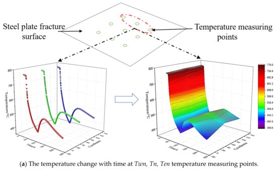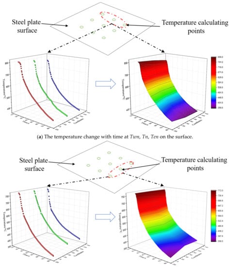 - The time and space are dispersed from the Tp position to the center of the steel plate surface. The time step is ∆t = 0.5 s according to the thermocouple response time. The calculation time is 12.5–77 s, i.e., the laminar spray cooling process, yielding N = 54/∆t = 109;