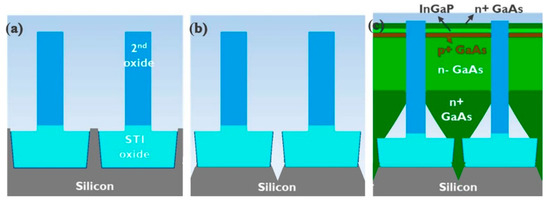 All nano-ridges (NR) shown in this paper were grown by metal-organic vapor-phase epitaxy (MOVPE) using a 300 mm industrial deposition chamber. The following precursors were used: tertiary butylarsine (TBAs), tertiary butylphosphine (TBP) and trimethylarsine (TMAs) for group V elements, triethylgallium (TEGa), trimethylgallium (TMGa) and trimethylindium (TMIn) for group III elements, and carbon tetrabromide (CBr4) and silane (SiH4) as p- and n-type dopants, respectively. Growth was conducted on 300 mm Si (001) wafers (n = 1 × 1019·cm−3) with a double trench-patterned oxide template (Figure 1). This template is based on two separate oxide deposition and patterning processes. Slightly tapered trenches (narrower towards the top), 70 nm by 100 µm along (110), embedded in a first 400-nm-thick SiO2 layer with a pitch of 920 nm are fabricated by a shallow trench isolation (STI) process. They are hereafter referred to as narrow trenches. The second oxide layer was deposited by chemical vapor deposition and then polished using chemical mechanical polishing (CMP) to a thickness of 1000 nm. After the trenches about 660 nm wide—hereafter referred to as wide trenches—in this second oxide were opened, centered at the narrow trenches, the Si embedded in the first STI oxide layer could be removed by etching with tetramethylammonium. This led to a {111}-faceted V-shaped bottom of the trench, which prevented the formation of anti-phase domains in the III–V layer. Prior to growth, the native oxide was removed from those {111} Si facets at temperatures below 200 °C in a Siconi™ chamber from Applied Materials. The patterned wafer was then transferred in N2 ambient atmosphere into the MOVPE reactor for the III–V deposition step.
