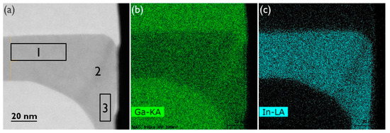 The InGaP/GaAs interfaces and top surface are flat. The contrast change at the bottom of the GaAs layer, just above the void, is related to the change in material thickness at the (111) facet, i.e., thinner towards the void. The top surface appears flat in the 5 μm sample that was inspected by TEM. However, the top-view SEM image in Figure 3b shows that there is some defectivity at the NR sides, which is more pronounced closer to the end of the trenches. At the trench ends, there is additional material loading from the oxide pattern that contributes to the locally enhanced growth rate of the NR in these regions. The enhanced growth rate causes the InGaP layer to come into contact with the oxide sidewall sooner, which, as will be discussed in a later section, results in defect generation. As the features are not large and sparsely distributed along the NR sides, they were missed in the TEM samples shown in Figure 2 and Figure 3. Asymmetrical (224) reciprocal space maps (RSMs) showed a weak signal from the thin InGaP layer, and an In mole fraction of about 0.41 could be deduced. The InGaP composition was also determined by EDS. For the top facet, region 1 in the HAADF-STEM image of Figure 4, an In mole fraction of 0.42 was estimated, which matches well with the composition extracted from the (224) RSMs. The following two interesting observations were made: First, region 2 in Figure 4a marks a darker vein in the InGaP layer running from corner to corner. The indium percentage here is only 33%, hence, the vein is Ga-rich. The vein extends from the corner as the NR grows. This compositional difference can also be observed in the EDS maps of the Ga-Kα (Figure 4b) and In-Lα (Figure 4c) X-ray emissions. Such a vein, or trace of the NR corner evolution during growth, was also observed for InGaAs NRs [23] and is caused by a dependency of the group III incorporation on the NR facet. Secondly, region 3, i.e., the (110) sidewall, has a slightly lower In mole fraction of 0.40, compared to the (001) top facet. This may also point to a different incorporation efficiency for Ga and In atoms on the (110) facet, or to a less efficient supply of the In species to the sidewall.