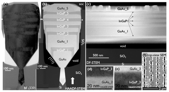 TEM of a 5 × GaAs/InGaP multilayer stack cut across the trench under (a) two-beam BF (220) and (b,d,e) HAADF-STEM and (c) of an off-center cut (at broad white arrow in (b)) along the trench under DF-STEM. The full NR images (a,b) are stitched. High-resolution images of the third InGaP layer’s interfaces are shown in (d,e). (f) Top-view SEM of NRs with defectivity at the NR sides and the pristine (001) top facet present in between.