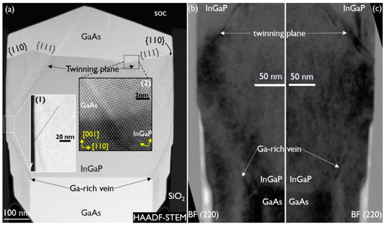 Inset (2) shows a high-resolution image of the GaAs/InGaP interface across the planar defect. The undisturbed and twinned lattice are resolved in detail, revealing a clear crystal rotation. As a result, the top facets of the NR are not part of the original crystal anymore, which has almost disappeared at the top. They are, in fact, the (110) facets of the twinned crystal. As there are also (111) planes present at the GaAs/InGaP interface, this points to a slow growth rate for (110) compared to (111) in GaAs. Figure 7b,c are BF (220) images of the left and right NR sidewall, respectively. The Ga-rich vein and the beginning of the twinned region are indicated in both figures. No other misfit defect is observed where the Ga-rich vein is in proximity of the oxide and the twin originates.