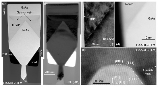 The trajectory of the Ga-rich vein is clearly visible in Figure 8a. The growth rate on the {111} facets is so high that first the empty volume is almost filled up, widening to form a quasi-box shape, after which the normal box growth takes over, with growth in the (001) direction and slower growth on the {110} facets. At that point, the Ga-rich vein also starts to follow a more expected, steeper path, as observed in Figure 7a. A (224) RSM showed the composition close to being lattice matched to GaAs and from EDS analysis above the Ga-rich veins, an In mole fraction of 0.46 was deduced. EDS analysis below the Ga-rich veins showed that the composition was the same. Figure 8e is an HAADF-STEM image of the GaAs tip. It looks like the tip has short segments of {113} and (001). Inspection of the image by inverse fast Fourier transform did not reveal any misfit defect at the interface. The Ga-rich vein is formed at the top of the {111} facet, at the corner with the {113} facet, and then moves outward, with the deposition on {111} filling up the empty volume. Reviewing Figure 4 again, one can observe the same mechanism, as follows: the Ga-rich vein develops at the corner of the {113} and {111} facets. As the sample of Figure 8 is free of any twin generation, although InGaP is in contact with the oxide, our hypothesis that the presence of the Ga-rich vein close to the oxide induces the planar defect via its strain field is supported.