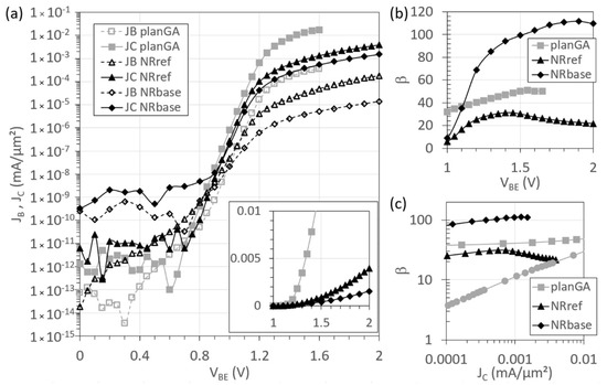 Figure 10 presents the Gummel plots with the base-collector junction at zero bias (VCB = 0 V), and the DC gain of these devices. The ideality factors of the collector current density, JC, versus the base-emitter voltage extracted from Figure 10a, are close to one (1.0, 1.1, 1.3) for the three devices. While the ideality factor of the base current density, JB, versus the base-emitter voltage for planGA is still close to one, those for the NR devices are much larger, as follows: 1.6 for NRref and 2.0 for NRbase. This is due to a large recombination current at the NR sidewall in the base-emitter space-charge region [19]. The ON current of the NR devices is lower than that of the planar device, due to series resistance effects, as observed in the inset of Figure 10a, where JC is plotted on a linear scale. The NRref base current is higher than that of NRbase, due to the different base doping levels. The leakage current of NRbase is higher, due to a fabrication issue. When the collector is biased by using the chuck instead of the top collector contact, a comparable leakage current is obtained. Figure 10b shows the current gain as a function of VBE. The maximum gain for these devices is 50, 31, and 112 for planGA, NRref, and NRbase, respectively. For NRbase, lower base doping was used, to enable a higher current gain. In the NRref curve, the current crowding manifests itself for VBE > 1.6 V, reducing the gain, and in the case of NRbase for VBE > 1.9 V. Although the ON current, at a certain VBE, is lower for NR devices than for the planar device, a higher gain could be achieved with the NR devices. In Figure 10c, we compare our devices to the lit-Ge/Si HBT, and it can be observed that NRE results in a better-performing device than growing on a Ge-on-Si buffer, due to the much lower defect density in the active III–V device layers.