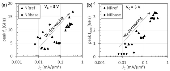 The cut-off frequencies, ft and fmax, for several HBTs with varying WE were extracted from S-parameter measurements. In Figure 11a, the peak ft for the NRref and NRbase devices is shown as a function of JC. Due to the emitter crowding effect, JC is larger for HBTs with smaller WE, which, in turn, leads to improved ft. At WE ~8 µm, an ft of ~17 GHz is achieved, which is comparable to the ft reported for GaAs-on-Si HBTs in the literature [34]. It is noted that fmax (Figure 11b) for the devices investigated here are significantly lower than the ft. This is attributed to the large WE and base contact size in these devices, which leads to large base resistance and base-collector capacitance. In addition, the fmax for NRbase HBTs is much lower than for NRref HBTs, due to a lower base doping in NRbase HBTs, which results in larger base sheet resistance. In this dataset, devices existing with a different number of NRs were used, but a correlation between the number of NRs and performance has not yet been found.
