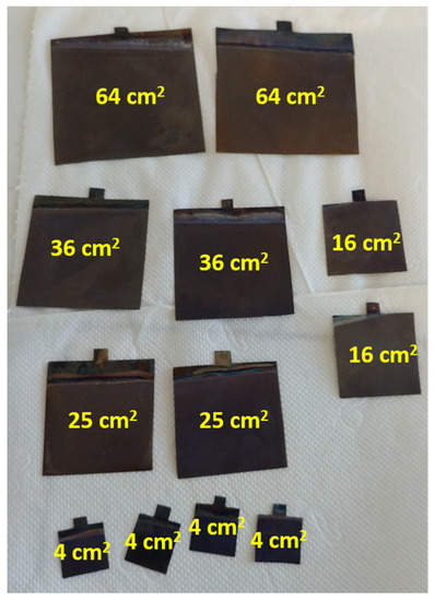 Titanium dioxide nanotubes were prepared by anodic oxidation of a titanium foil (99.7%, Sigma Aldrich, Waltham, MA, USA) immersed in a solution consisting of 0.27 M ammonium fluoride, 1 M orthophosphoric acid, 5% v/v water, and 95% v/v ethylene glycol. Initially, titanium foils with a thickness of 0.127 mm were cut into pieces with an area of 4, 16, 25, 36, or 64 cm2. The given electrode area did not include the additional parts of the plate intended for installation in the measuring system. Afterward, the plates were placed in an ultrasonic bath with a 1:1 mixture of 2-propanol and acetone for 20 min. Clean plates were then electrochemically anodized in a two-electrode system: a titanium plate acted as an anode, while a platinum mesh basket was used as a cathode. Electrochemical anodization was performed for 2 h at a constant voltage of 40 V. During the anodization, the temperature was kept constant at 23 °C using a thermostat (Humber Kiss K6, Huber UK Temperature Control Ltd., Derbyshire, UK). The experimental setup was the same as that proposed in [30]. Throughout the electrolysis, the solution was stirred at 150 rotations per minute (rpm) using a magnetic stirrer (Bionovo, Legnica, Poland). Once the process had been completed, the plates were washed with distilled water and calcinated in the air by heating them to 450 °C for 3 h 45 min; for another 2 h, the temperature was maintained at this level. According to the size of the samples, they were denoted as TN4, TN16, TN25, TN36, and TN64 for areas 4, 16, 25, 36, and 64 cm2, respectively. The calcination process was necessary to convert the amorphous phase of the TiO2 into a crystal. Figure 1. shows images of the titanium plates after the anodization and calcination processes.
