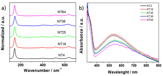 Figure 3. (a) Raman spectra and (b) the absorbance spectra recorded for a series of titania nanotube electrodes of different dimensions.