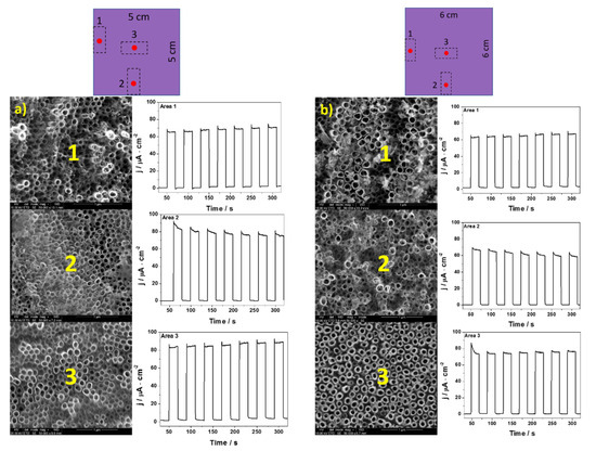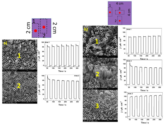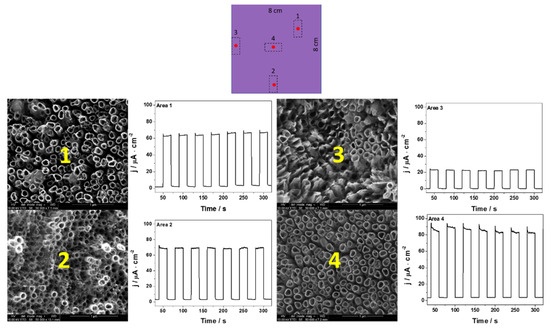In Figure 4, Figure 5 and Figure 6, the transient photocurrent responses recorded at a constant potential of 0.5 V vs. Ag/AgCl/3 M KCl are presented for the analyzed samples. In order to more accurately characterize the electrodes, the photoelectrochemical and SEM (in the center of each cut electrode) measurements were made at various spots on the material. The values of photocurrent density for each sample registered in different places on the electrodes (after 100 s of measurement) are listed in Table 2.