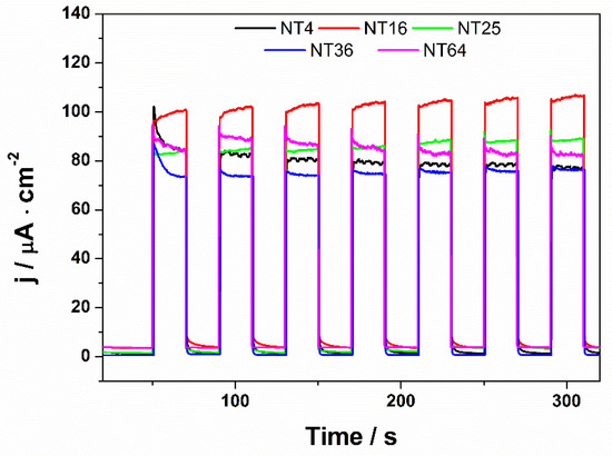 In order to analyze the photoelectrochemical properties of the samples, the electrodes were exposed to radiation generated by a 150 W xenon lamp (LOT LS0500/1, LOT, Darmstadt, Germany) equipped with an AM 1.5 filter and a controllable light shutter. The intensity of light was adjusted to 100 mW·cm−2 using a Coherent® FieldMate Laser Power Meter. Transient photocurrent studies were performed under a constant polarization of the working electrode, which was set to 0.5 V vs. Ag/AgCl/3 M KCl. Photoelectrochemical measurements were carried out in a 0.2 M K2SO4 electrolyte. In order to accurately characterize the specific areas of the electrodes, photoelectrochemical tests were carried out in various spots of the samples. For this purpose, several equal fragments of 0.7 cm per 1.5 cm were cut from each TiO2NT electrode.