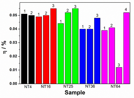 Emeas is the electrode potential (vs. SCE) of the WE at which the photocurrent was measured during illumination, Eoc is the electrode potential (vs. SCE) of the WE under open-circuit conditions, and during illumination, J is the photocurrent density, and Io is the input intensity of the light source. The efficiency calculations were made for all the electrodes and are presented in Figure 8. They are also given in Table 2. As it can be seen, the conversion efficiency values are comparable for all the obtained electrodes (they are about 0.040–0.055%), with one exception for the TN64 material (area 3). The obtained result (as in the case of low photocurrents) is probably due to the lack of an ordered structure in the form of nanotubes.