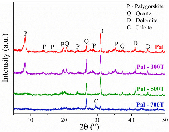 The X-ray diffraction patterns of natural and heat-treated palygorskite samples (300, 500 and 700 °C) are shown in Figure 1. As expected, the natural sample showed reflections of palygorskite (ICCD 21-0958), quartz (ICCD 46-1045) and dolomite (ICCD 36-0426) [45,67,68]. According to the heat treatment applied, different changes in the crystal structure were observed. For example, there was only a slight decrease in the characteristic reflections of palygorskite for the samples treated at 300 °C. Such behavior happened because there is a loss of zeolitic water at this temperature and a partial loss of coordinated water [69,70,71]. It is still possible to observe peaks characteristic of palygorskite in the Pal-500T sample; however, these reflections disappeared after heat-treatment at 700 °C (Pal-700T). The loss of crystal identity in the Pal-700T sample occurs due to the total loss of coordinated water and irreversible dehydroxylation [61,72,73]. The characteristic reflections of quartz were unchanged, even after treatment at 700 °C for 4 h [61,74]. Calcite (CaCO3, ICDD 89-1305) was identified in the Pal-700T sample. The occurrence of calcite is related to the first stage of dolomite decomposition, which involves the nucleation and growth of CaCO3 particles [61,75,76,77].