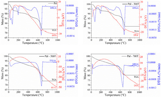 The thermogravimetric (TGA), derivative thermogravimetric (DTGA) and differential thermal (DTA) curves of the natural and heat-treated palygorskite are shown in Figure 2. Four mass loss events can be identified on Pal’s TGA-DTGA curves. The first event occurred at 23–125 °C with a mass loss of 6.54% and is related to the evaporation of water physically adsorbed on the surface of the palygorskite [79]. The second event (125–230 °C) presented a mass loss of 2.46% and is related to the loss of zeolitic water molecules located in the palygorskite channels [72]. The third event observed between 230–530 °C was attributed to coordinated water loss and condensation of silanol and aluminol groups [54,80], which resulted in a mass loss of 5.26%. The last event occurred at 530–720 °C and showed a mass loss of 11.74% was caused by dolomite decomposition [81]. These four endothermic events resulted in a total mass loss of 26%. The DTA curve confirmed these events with endothermic peaks in the same temperature range as the mass losses in the TGA-DTGA curves. The peaks were attributed to: (i) evaporation of physically adsorbed water molecules [82], (ii) release of zeolitic water molecules [73], (iii) coordinated water removal, as well as the condensation of surface groups [83] and (iv) dolomite decomposition [84].