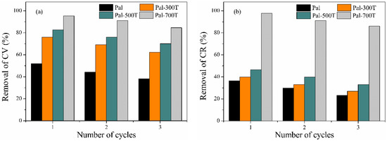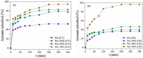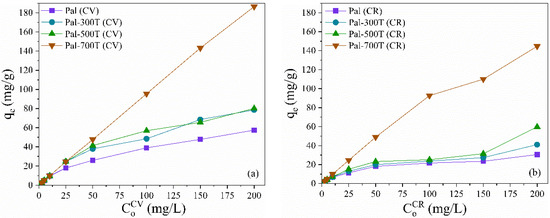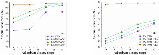 Different amounts of adsorbents (10–40 mg) were used to adsorption 50 mg/L of CV and CR at 25 °C for 360 min at pH 7 (Figure 10a,b). Almost complete removal of CV and CR, both 96%, was observed with 10 mg of Pal-700T; therefore, further increase in adsorbent dosage to 40 mg has little effect on removal percentages. For the other samples, the adsorbed amount increases considerably when the mass of the adsorbent increases from 10 to 40 mg; this can be attributed to the increase in the adsorption sites available for the removal of CV and CR [113,114]. With 40 mg of adsorbent, the CV removal rate was 82.5%, 94.6%, 97.1% and 98% for Pal, Pal-300T, Pal-500T and Pal-700T, respectively. For CR, the removal rate was 61.1%, 62.9%, 66.8% and 98%, for Pal, Pal-300T, Pal-500T and Pal-700T, respectively.