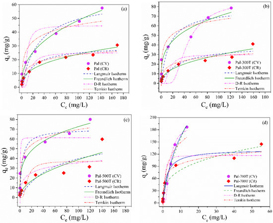 Nonlinear adsorption isotherms (Langmuir, Freundlich, D-R and Temkin) of CV and CR for (a) Pal, (b) Pal-300T, (c) Pal-500T and (d) Pal-700T.