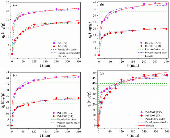 Nonlinear adsorption kinetic models (Pseudo-first order, Pseudo-second order and Elovich) of CV and CR for (a) Pal, (b) Pal-300T, (c) Pal-500T and (d) Pal-700T.