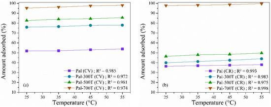 The temperature analysis was carried out in the range of 25–55 °C with initial solutions of CV and CR of 50 mg/L, amount of adsorbent 20 mg at pH 7 for 360 min and the results obtained are shown in Figure 7a,b. The results showed an increase in adsorbed amounts with increasing temperature, suggesting that the adsorption of CV and CR dyes in palygorskite samples is an endothermic process [103]. This increase is a consequence of the increased mobility of CV and CR ions to the surface of the adsorbent [45,104].