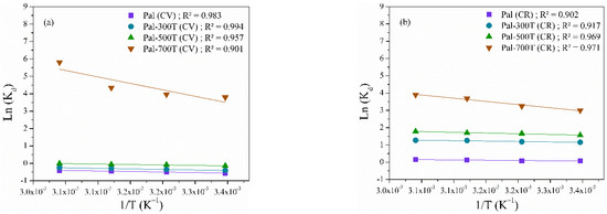 On the other hand, the result of the mathematical adjustments performed for the samples Pal, Pal-300T and Pal-500T showed that the Freundlich model was the one that best fit the experimental data of adsorption of CV and CR, as it presents R2 values closest to 1. Values of 1/n indicated that adsorption was favorable for all samples [94]. The Freundlich model is the best isothermal model implies that, based on its assumption, the adsorption of both dyes on Pal, Pal-300T and Pal-500T occurs on a heterogeneous surface with the formation of multiple layers [96,97].