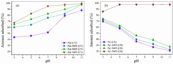 The pH is one of the main parameters in the adsorption process, as it influences the surface charge of the adsorbent [3]. The pH influence on the adsorption capacity of palygorskite samples was analyzed in the pH range of 3–11 with 20 mg of adsorbent and initial solution of CV and CR of 50 mg/L, for 360 min. All experiments were carried out at room temperature (25 °C). The pH adjustment of the dye solutions was performed using 0.1 M HCl or NH4OH. The amount of CV and CR adsorbed was strongly dependent on the initial pH of the solution (Figure 9a,b). The adsorbed amount of CV increased with increasing pH. The adsorbed amount of CR decreased as the pH increased (except for Pal-700T). In an acidic medium, H+ ions present in the solution protonate the surface of the palygorskite and the functional groups (–Si–OH) on its surface become–Si–OH2+ [45,53]. Therefore, the cationic CV dye adsorption is less efficient, as there is competition between the H+ ions and the CV molecules for the adsorption sites and the repulsive force between the surface of the positively charged adsorbent and the CV molecules decreases the removal efficiency [108]. On the other hand, in an acidic medium, the negatively charged CR molecules interact electrostatically with the positively charged palygorskite surface, presenting a higher adsorption rate [109].